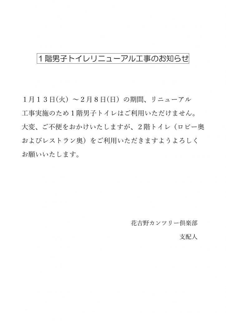 1階男子トイレリニューアル工事のお知らせ