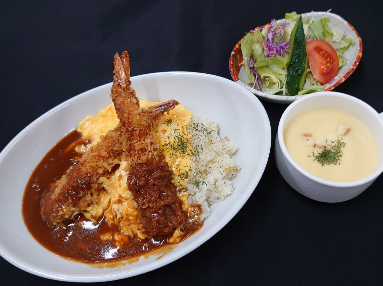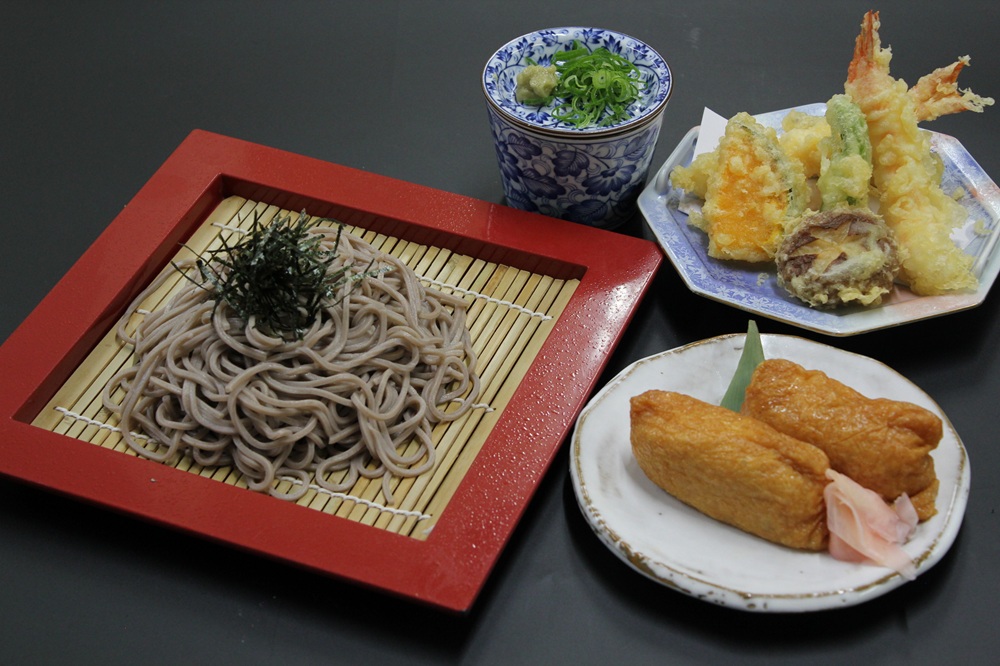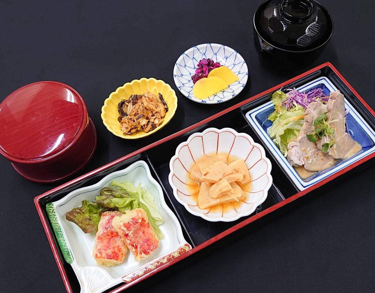 お造り盛り合せ/牛カットステーキ/天ぷら盛り合わせ/煮物/ご飯/香の物/味噌汁/くず餅