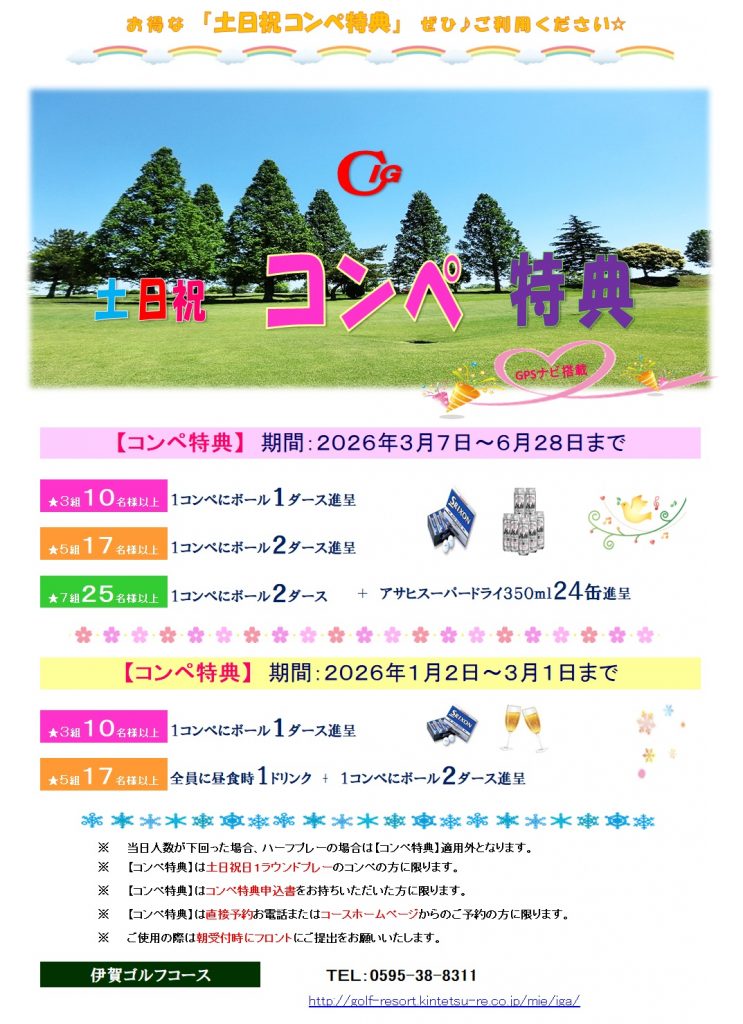 2026.01.16 幹事様必見!土・日・祝日コンペ特典♪ コンペ特典申し込み用紙をプリントアウトし、プレー当日コースにお持ちください。 ●【3/7~6/28】コンペ特典申し込み用紙 ⇐ クリック ●【1/2~3/1】コンペ特典申し込み用紙 ⇐ クリック 一覧ページへ戻る