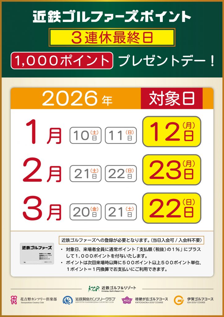 この度、2026年1月~3月の3連休最終日の来場で、近鉄ゴルファーズポイント1,000ポイントをプレゼント!!