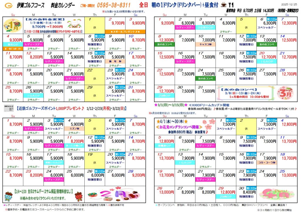 料金カレンダー(2026.1月~4月)オトク日・2サムデーが確認いただけます。