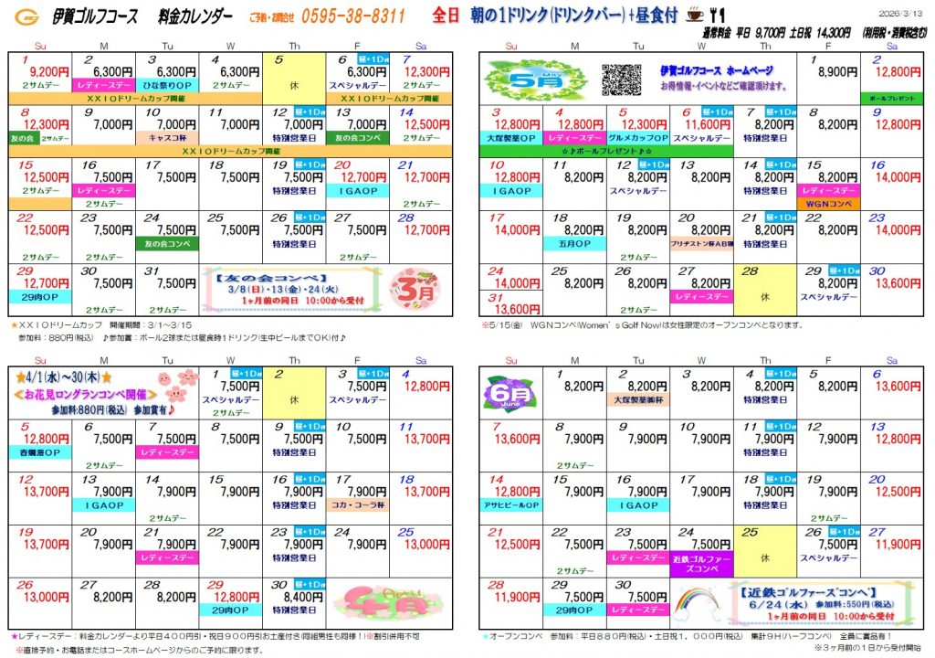 料金カレンダー(2026.3月~6月)オトク日・2サムデーが確認いただけます。