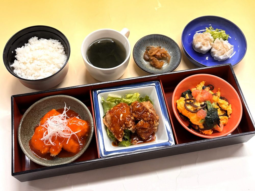 エビチリ/油淋鶏/中華風卵の炒め物(卵/ほうれん草/木耳/トマト)/焼売/ご飯/スープ/ザーサイ