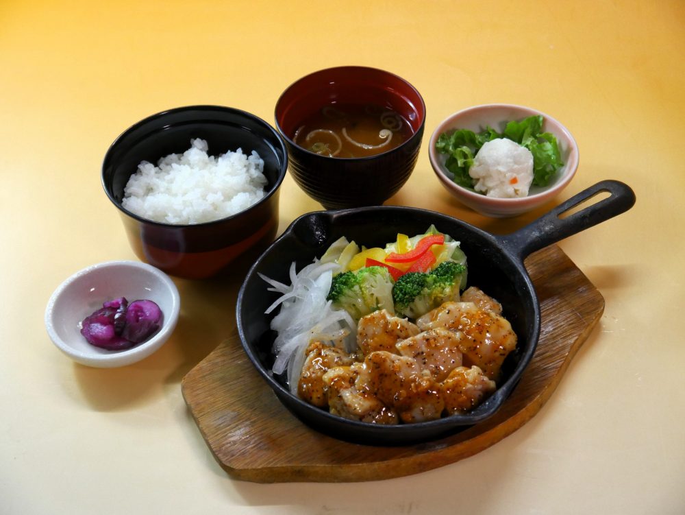 チキンペッパー焼き(チキン/玉ねぎ/ブロッコリー)/ポテトサラダ/ご飯/味噌汁/香の物