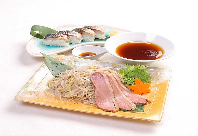 ”山椒が香る”合鴨と白葱のつけ蕎麦と炙り鯖の押し寿司