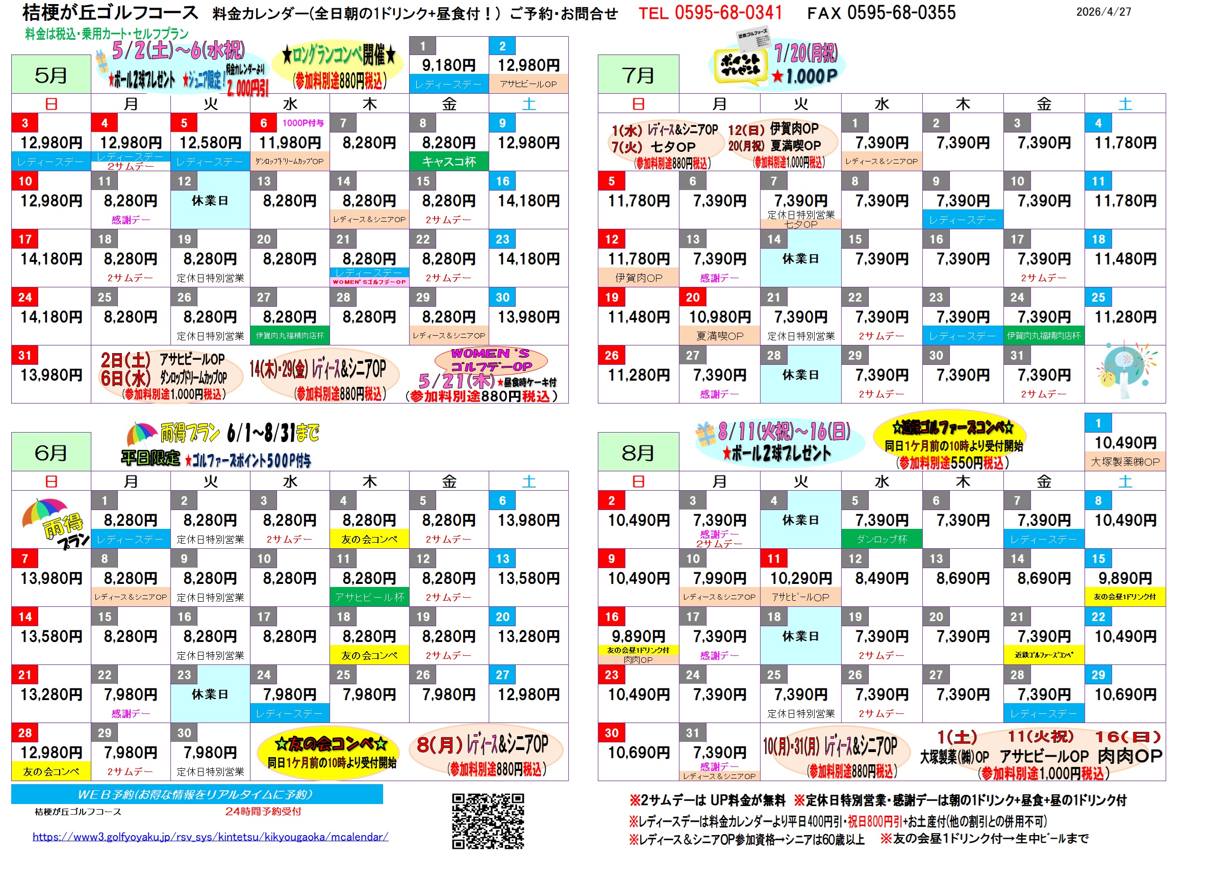 【料金カレンダー】2026年8月までの料金が確認いただけます。