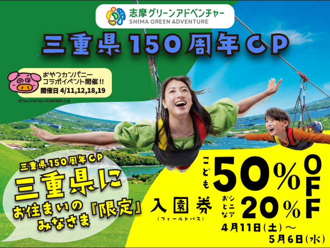 三重県誕生150周年をお祝いする企画として、志摩グリーンアドベンチャーと、三重県を代表するお菓子メーカー「おやつカンパニー」とのコラボ企画を開催✨